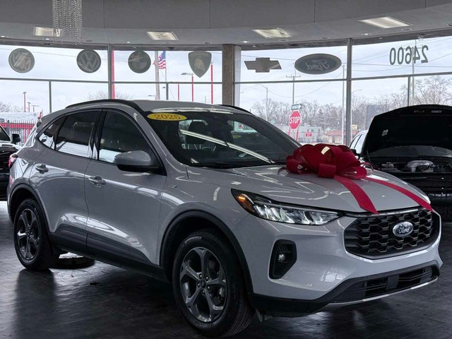 The 2025 Ford Escape ST-Line Select AWD is a striking display of modern engineering and sleek design. Its exterior, painted in a captivating Space Silver, offers a sophisticated and futuristic aesthetic that seamlessly blends with the urban landscape. Complementing its chic exterior, the interior boasts a refined Ebony color with red stitching, creating a luxurious atmosphere that invites both driver and passengers to settle in comfortably. Under the hood, you’ll find the robust 2.0L EcoBoost four-cylinder engine, paired with an 8-speed automatic transmission, ensuring responsive handling and a dynamic driving experience. The All-Wheel Drive (AWD) drivetrain, coupled with a 3.47 axle ratio, delivers both power and precision, making it well-suited for diverse road conditions and a variety of driving styles. Safety is a top priority with features like a blind spot monitor, forward collision warning, lane departure warning, and lane keep assist, all working in concert to protect and inform. Convenience is equally prioritized in the Escape ST-Line with its thoughtful amenities designed for modern life. Remote start functionality offers unparalleled convenience, especially in extreme weather conditions, while the power liftgate adds ease and accessibility for loading and unloading. The vehicle is also equipped with a towing package, expanding its utility for adventurous excursions. Inside, heated seats enhance comfort during cooler months, while the integrated Bluetooth system ensures seamless connectivity on the go. The high-tech LED headlights provide clear and efficient illumination, enhancing visibility during nighttime driving. With the inclusion of the Equipment Group 401A, this stylish crossover embodies an ideal blend of functionality, safety, and elegance.